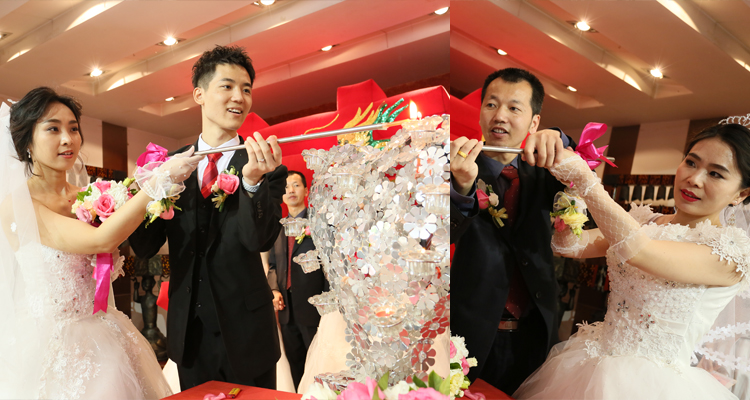 婚宴中,将一对一对举办室内婚礼仪式。二位新人来到烛台前,燃点这爱情的烛火,为你们照亮这浪漫之路。这是爱情的烛火,在这里这火焰将会点燃,让烛光映衬着你们幸福的笑脸,让烛火为你们祝愿,祝愿你们夫唱妇随永远相爱。------祝福你们,同行的伴侣,祝福你们,知心的爱人,祝你们同行的路上携手并进,祝你们知心的话儿地久天长。二位新人来到香槟塔前,这里有一座爱情的香槟塔,