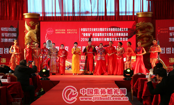 辞岁迎新,在2017 年元旦即将来临之际,中国东方文化研究 会婚俗文化专业委员会举办了“2016年中国首届婚俗婚礼大赛”,这是中婚俗委员会成立后的第一个赛事活动。旨在通过赛事活动,贯彻落实习近平总书记提出的:要结合新的时代条件传承和弘扬中华优秀传统文化,传承和弘扬中华美学精神。弘扬东方文化,传承传统婚俗,倡导现代文明婚礼,引领未来中国婚礼发展的导向。让中国婚俗文化的精髓“婚嫁五意——福禄寿喜财”深入人心,让中国新娘穿“中国嫁衣”的婚道思想广为流传。同志们,今天,我们举办“2016年首届婚俗婚礼大赛”,不图参与人数有多少,规模有多大,就是尝试,就是引领,就是推广,就是试着揭开婚礼这个人类世界文明,让我们去穿越千年,重回远古、周制、先秦、汉唐、宋元、明清,以及民国各历史朝代婚俗礼仪,追求现代婚礼“文化厚度”“创意高度”“体验深度”。千年婚俗,华夏文明,大树特树“美德,让家庭更幸福”“家训,让好家风沁润行风”“关爱,让夫妻更和睦”的婚礼时尚之风。