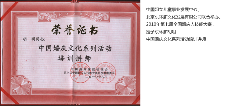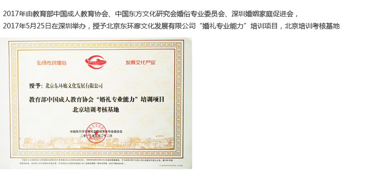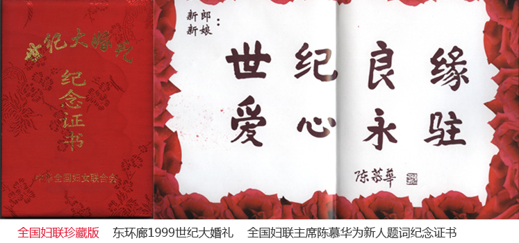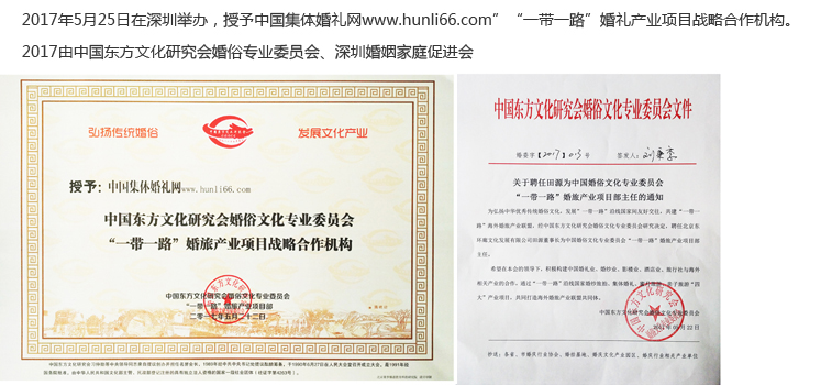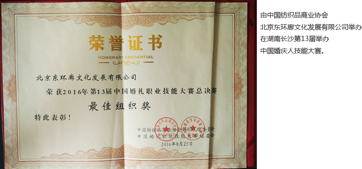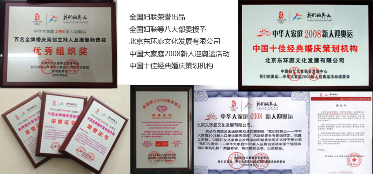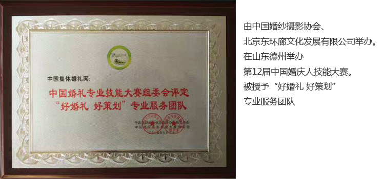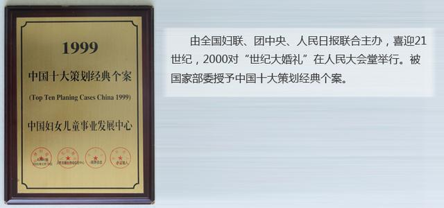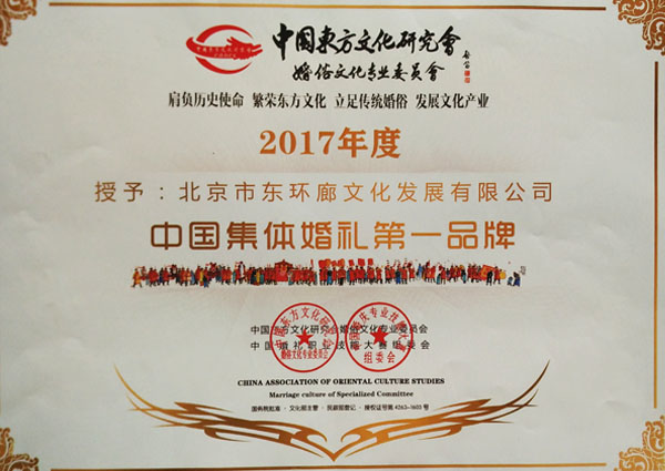 集体婚礼著名品牌;1992年运做了第一届集体婚礼,在长城上踏上红地毯。2001年创建中国妇女儿童事业发展中心中国集体婚礼网。中国婚庆行业联盟、中国集体婚礼网、东环廊国际婚礼策划机构共同指导策划 。这些集体婚礼融喜庆于大自然之中,尽显清新自然、浪漫、时尚,受到全国广大新婚佳偶的青睐。集体婚礼已成为中国品牌文化婚礼。其中1999年底举办的“2000对世纪大婚礼”,被评为“中国十大经典策划,全国妇联珍藏版。2011年4月29日承办清华百年千人集体婚礼,媒体报道全球关注。雄厚的资源实力,合理的价位,永远立足于中国集体婚礼著名品牌。