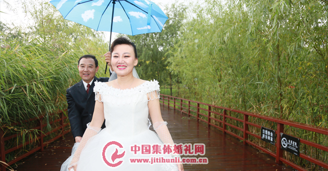 雨水拍打在鲜花上,让姹紫嫣红的花儿更加炫目;伉俪新人虽然冒雨,但笑容和欢乐已经充满了整个外景基地。他们虽然已经年过半百,但幸福和快乐一直在充实着,直到金婚、钻石婚直至更久。